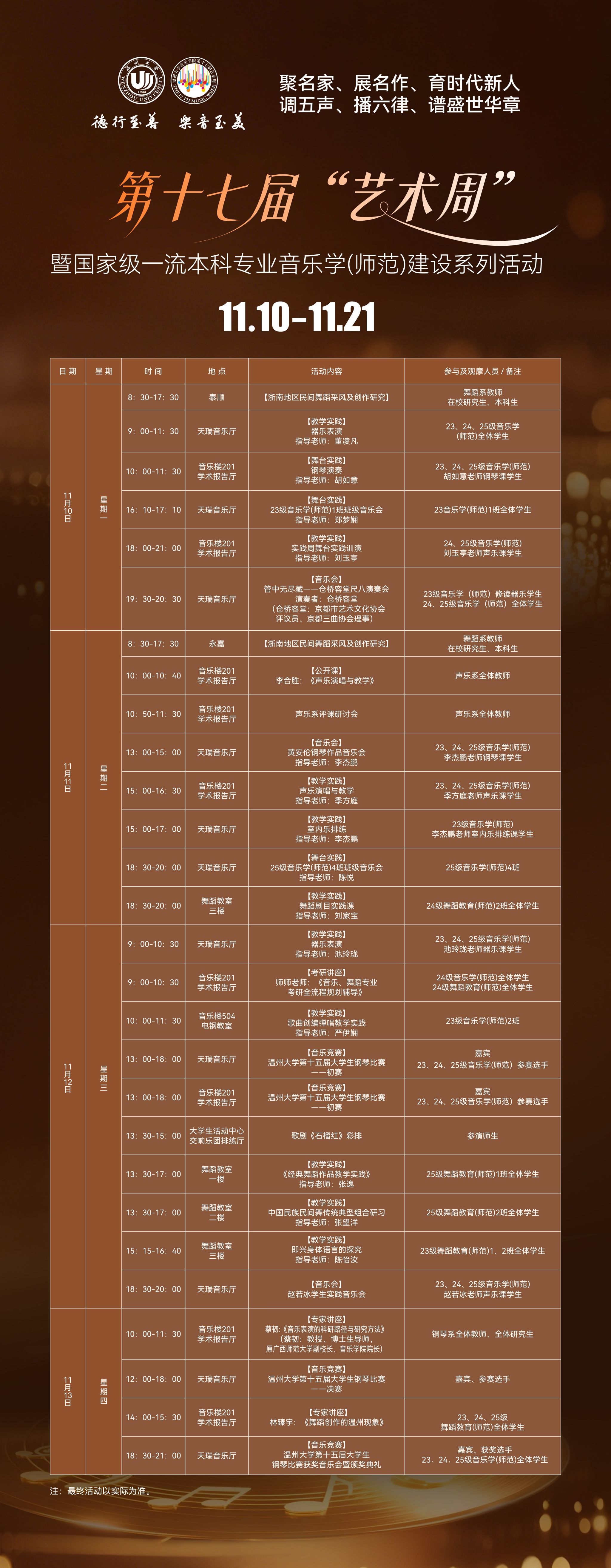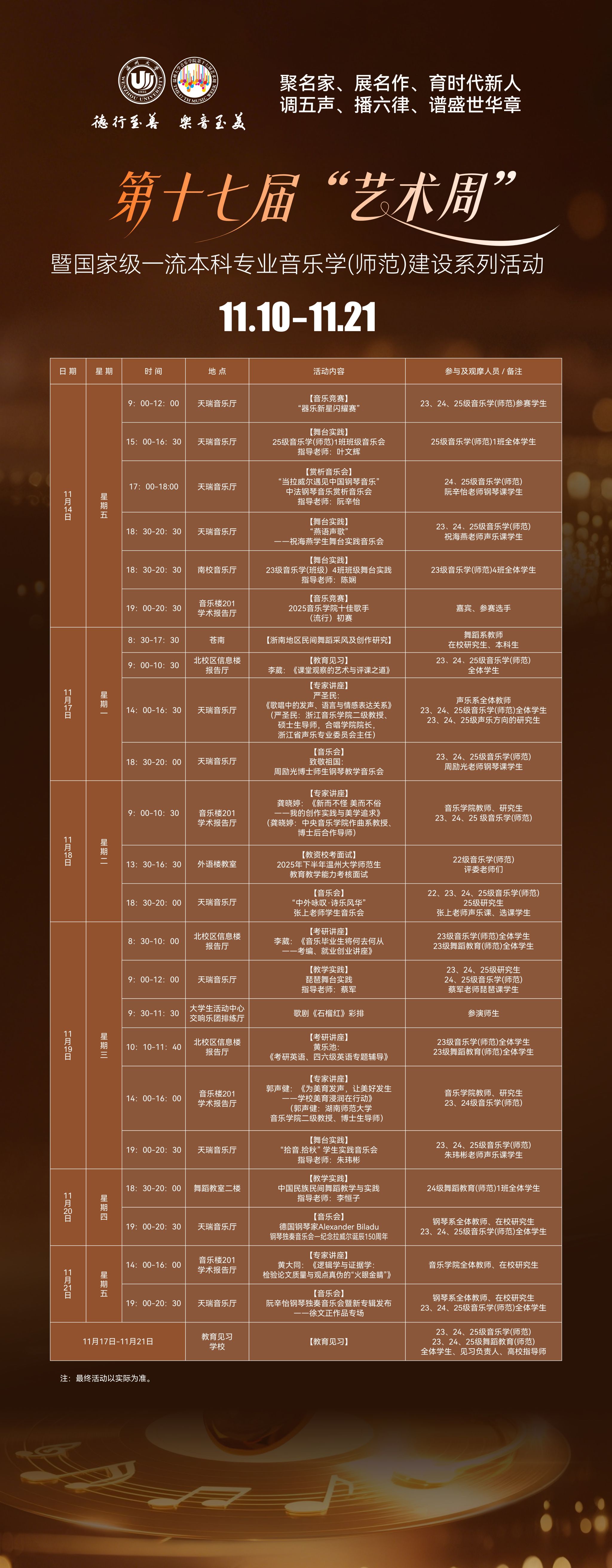 “艺术周”自2009年创办以来,已连续成功举办十六届,作为学院专业特色项目被纳入人才培养方案,成为常态化开展的艺术实践平台。第十七届“艺术周”暨国家级一流本科专业音乐学(师范)建设系列活动将于2025年11月10日至11月21日举行。