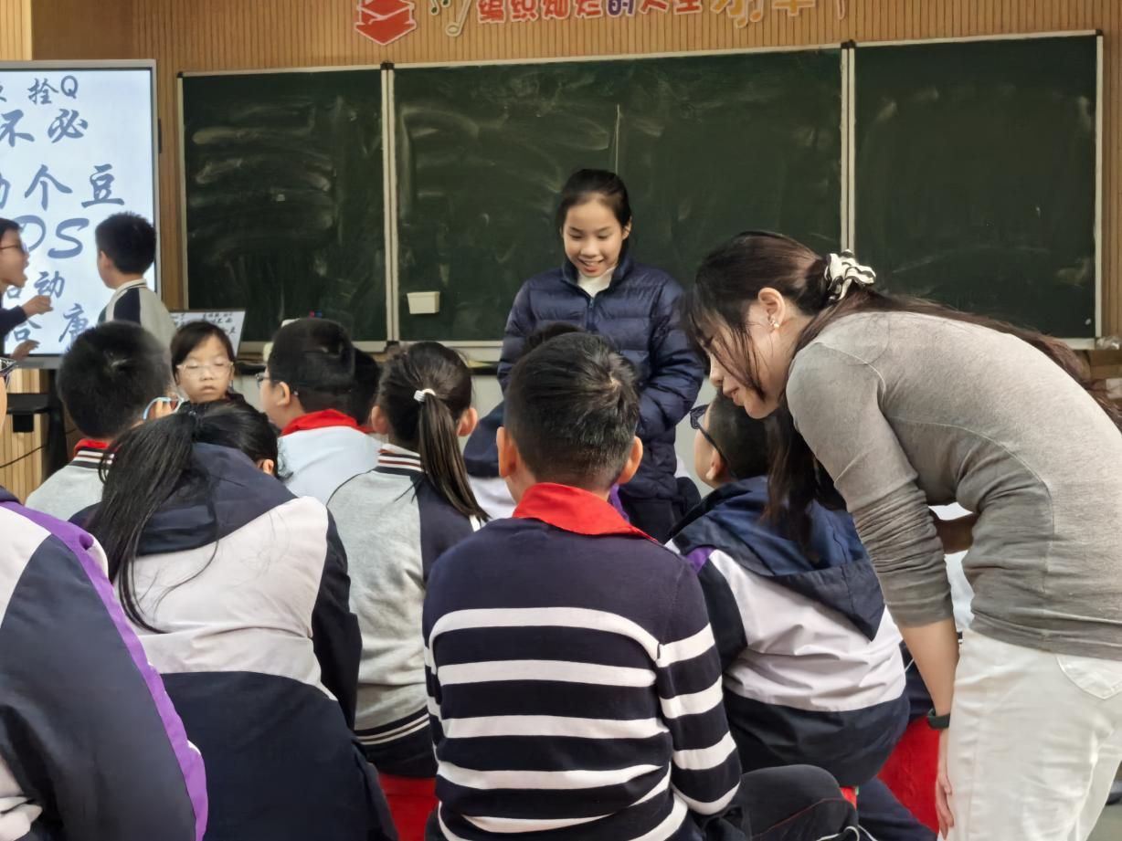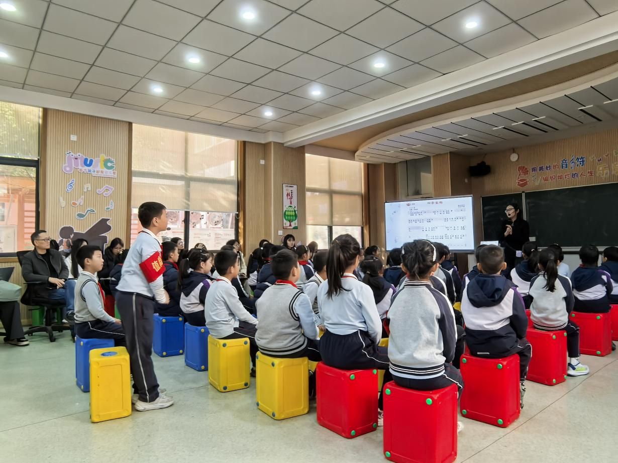 音乐课伊始,我校实习教师刘思彤学姐以“四季是什么颜色”引出《四季童趣》歌曲,把柳叶摇风、雪人眨眼搬进教室;春之嫩绿、夏之湛蓝、秋之金穗、冬之棉雪,五分钟让抽象旋律长出可视触角。孩子先看见再唱出,用身体把起伏写成音乐就是我的生活。评价不留好差,只剩同伴互夸——轮流说出最打动我的那一瞬,倾听与欣赏在此刻生根。教师俯身对准童龄,节奏变闯关、音色化寻宝、情感成故事,层层拆墙,让每个孩子找到专属童趣声部:音乐课不是教会一首歌,而是借一首歌点燃热爱,把生活唱成歌。