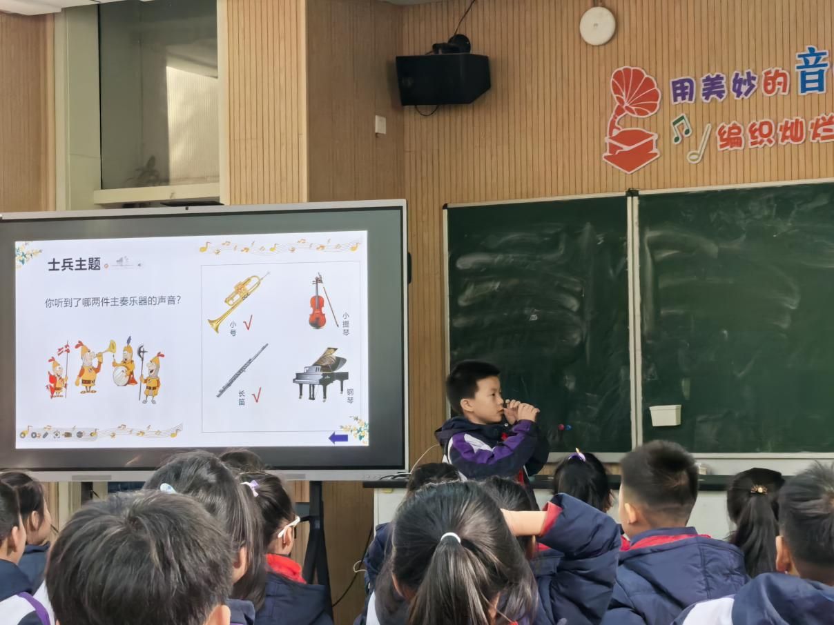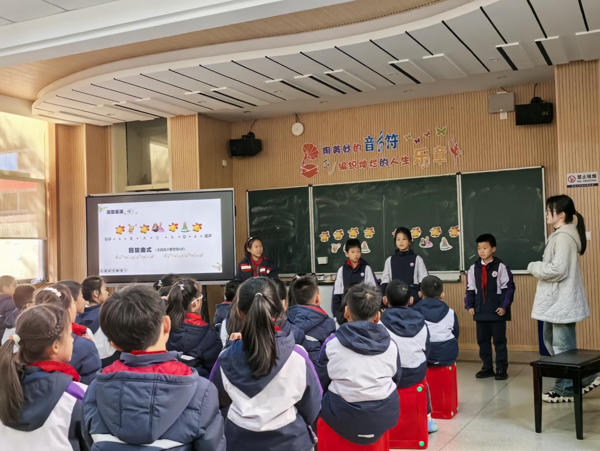 我校实习教师胡泽欣为三(5)带来“维也纳之声”。圆舞曲起,金色大厅史、旋律、礼仪化作看唱跳;文化随音符淌,洞见本真:经典要活在孩子呼吸笑声里。课似声音滑梯,把古典钟乐送进掌心。先声夺人:旋律填词问好,闭眼倾听维也纳钟声,一秒辨清脆-厚重;动画钟摆跃屏,音符快慢可视,旋律现童话形。主曲拆-合-创:臂画高低线,图猜乐器+独奏验证,三角铁、钢片琴、大提琴依次亮声;分组身体打击乐还原钟鸣对答。教育真谛,是以专业智慧搭传统-现代桥,守护初心,让童真在经典里感文化,在创造中放光芒。