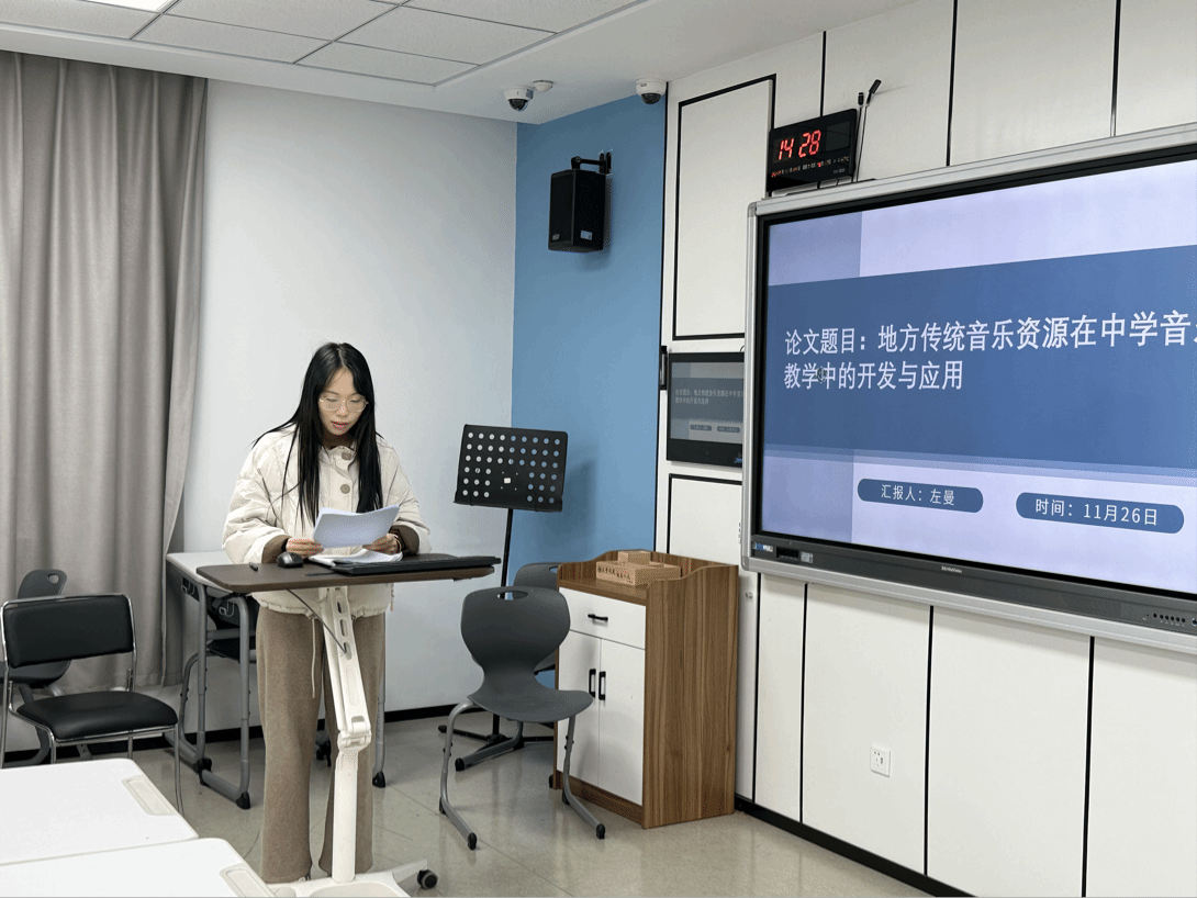 报告会上,毕业生依次登台,通过PPT演示等形式,围绕各自的论文选题、研究背景、核心框架、研究方法及预期成果进行详细汇报。研究主题紧扣音乐学科发展与教育实践需求,涵盖传统音乐传承、音乐课堂教学创新与美育实践探索等多个领域,展现了同学们扎实的专业基础与鲜明的实践导向。