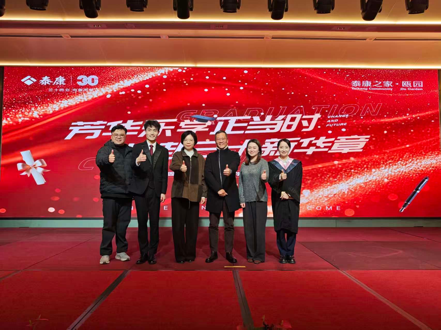在温馨而隆重的瓯园乐泰学院结业典礼上,杨振海代表学院向泰康之家·瓯园授予“温州大学音乐学院艺术实践基地”铜牌。整场结业典礼演出的策划、主持与排练,均由已入职瓯园的温大毕业生骨干承担。他们以专业的技艺和真挚的情感,不仅为结业典礼增添了光彩,更生动展现了从学院到职场的成长与风采。这场活动既是一次艺术的呈现,也成为母校深入行业一线、看望慰问毕业生、传递持续关怀的温暖场合。