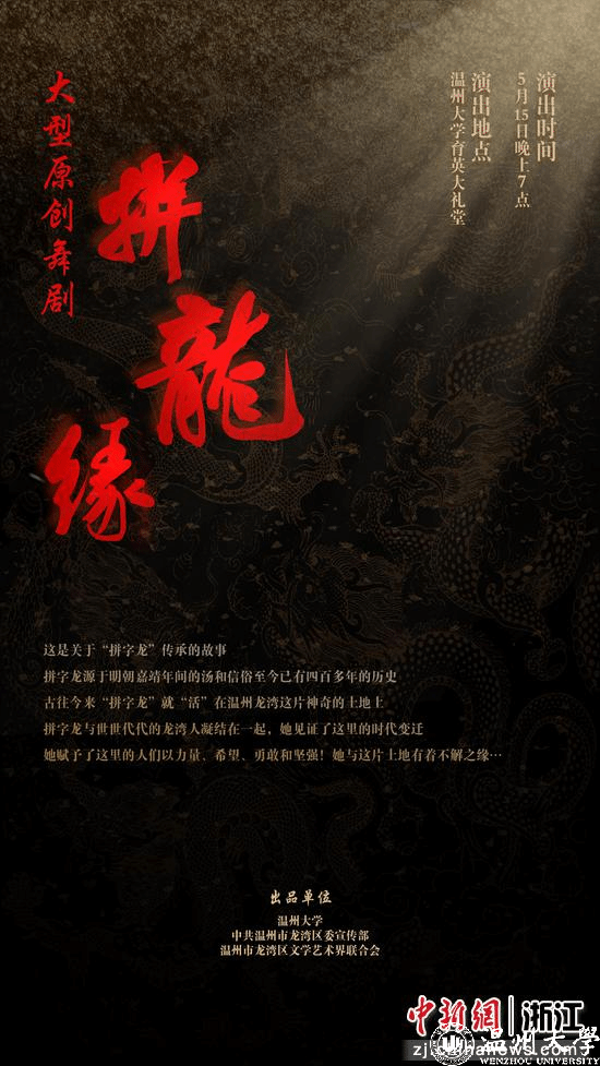 本次原创舞剧《拼龙缘》是由龙湾区文联与温州大学音乐学院联合打造。该剧主要讲述“龙把头”女主人公与“拼字龙”的一生之缘,并以此展现出龙湾独特的文化底蕴和城市魅力。