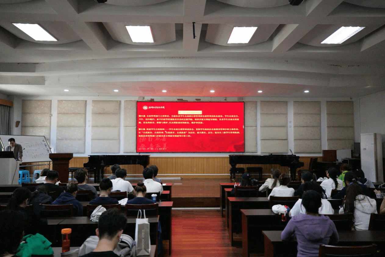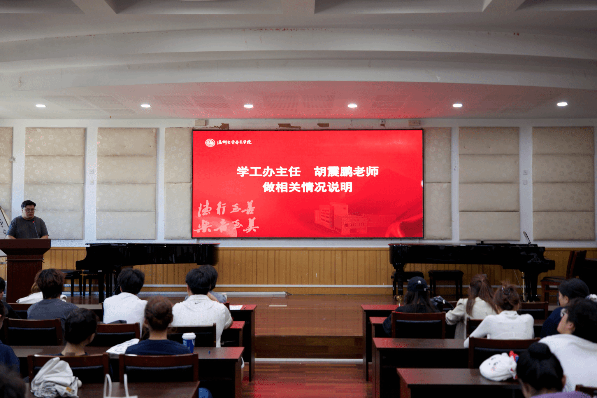 为进一步规范宿舍管理,夯实育人阵地基础,营造安全、文明、和谐、有序的学习生活环境,10月31日音乐学院组织召开2025级本科生、研究生新生寝室长大会,学院党委副书记林海红、学工办主任胡震鹏、公寓辅导员张凯、胡奕迪及全体新生寝室长参加会议。