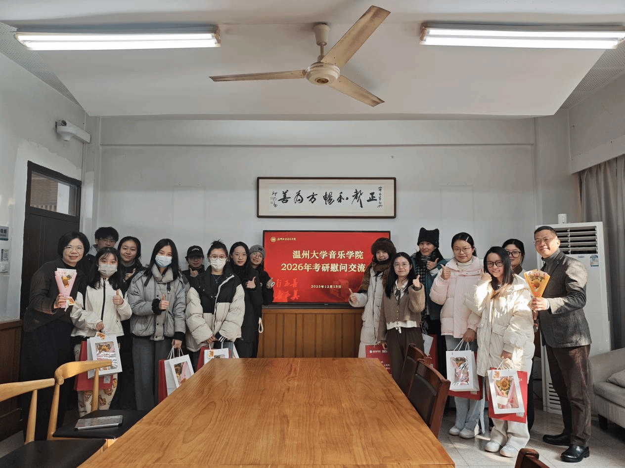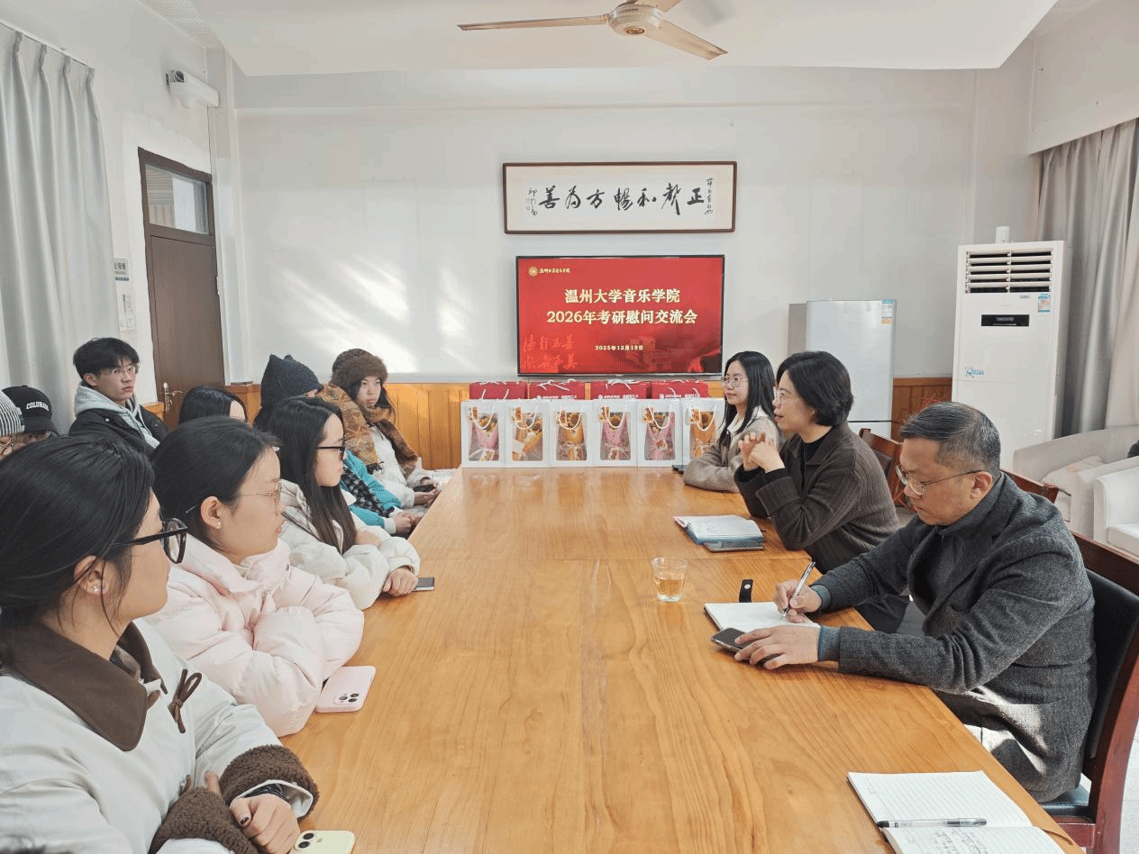 12月15日下午,温州大学音乐学院2026届考研慰问活动在音乐楼202会议室温暖开展。近20名考研学子齐聚一堂,院党委书记杨振海、党委副书记林海红、学工办主任胡震鹏也来到现场,与同学们亲切交流,分享经验、叮嘱鼓励、传递关怀,为即将踏入考场的学子舒缓压力、点亮“研”途星光。